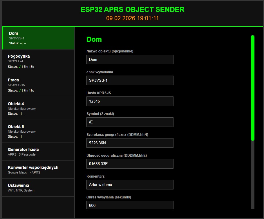 Prosty układ oparty na ESP32, który umożliwia statyczne wysyłanie obiektów do serwera APRS. Można wprowadzić 5 obiektów, lokalizację, ikonę i komentarz. Harmonogram pozwala na wysyłanie w określonych godzinach. Konwerter jednostek konwertuje lokalizację z Map Google na wartości zgodne z APRS. Generator haseł APRS obliczy hasło dla Twojego znaku wywoławczego. W ustawieniach można zmienić SSID i hasło Wi-Fi (należy wprowadzić pierwszy SSID i hasło w kodzie!), a także zmienić serwer NTP i strefę czasową.